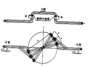 旋轉補償器的補償原理與鉸鏈型波形膨脹節相似,要用兩個或者兩個以上的補償器組合,利用其角位移的變化才能補償位移。兩者_的不同_是:鉸鏈型波形膨脹節是靠波紋管的變形產生角位移的,而旋轉補償器是靠旋轉管的旋轉產生角位移的,它需要一個力(由管道熱膨脹產生)和一個力臂形成一個力矩才能推動其旋轉。因此,它不能與管道中心線同心,而應與其垂直,這樣才能通過設置一個力臂連接兩個旋轉補償器。當一端管道熱膨脹推動力臂沿一個旋轉補償器旋轉時產生一個力矩,連接力臂另一個的旋轉波紋補償器產生一個反力矩,一對力矩大小相等,方向相反,形成力偶,達到力的平衡。